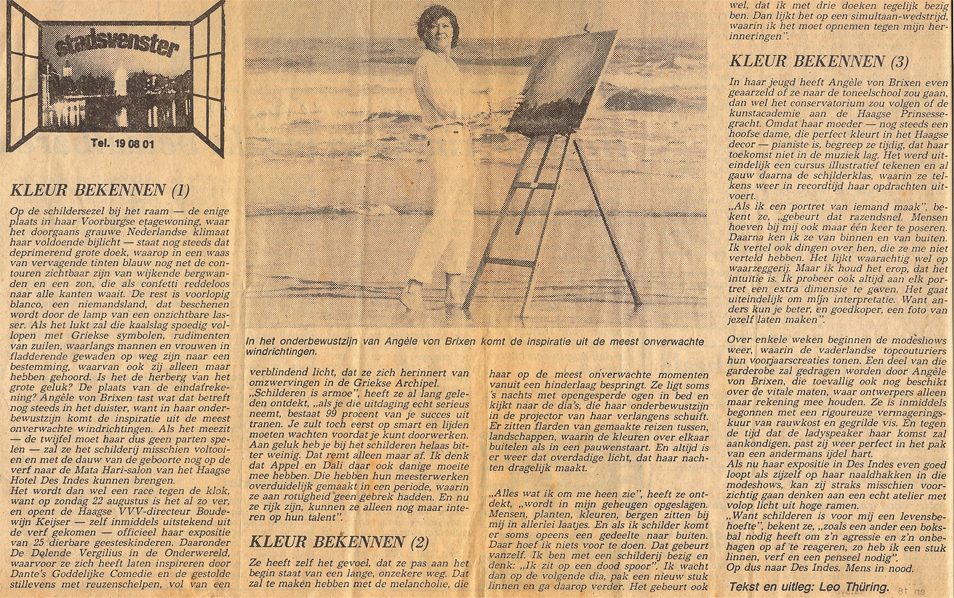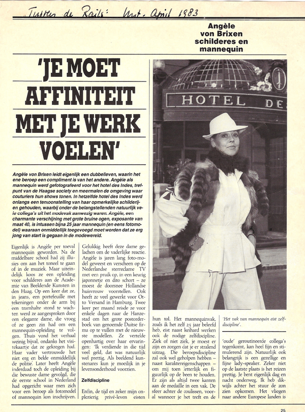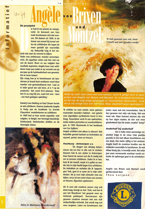 Angele von Brixen is geboren in Den Haag. Zij genoot haar opleiding aan de Koninklijke Academie voor Beeldende Kunsten in Den Haag en aan de academie la Grande Chaumiere in Parijs. Haar docenten aan de K.A.B.K. waren o.a. Paul Citroen en Cees Bolding. Zij is opgenomen in Beeldend Nederland vanaf 1945 door Dr. Frans Jacobs. Zij is werkend lid van de kunstenaarsvereniging Arti-Brak in Voorburg waar zij ook woont. In 1970 startte haar eerste expositie in Amsterdam waarna er velen binnen en buiten de Europese grenzen volgden. Rond 1980 startte zij met haar intuïtieve schilderijen wat in de loop der tijd veel navolging kreeg. Tot op heden kenmerkt een speciale lichtval en claire obscure stijl haar werken. Vanaf 1980 doceerde zij tekenen en schilderen aan vele kunstacademies in Nederland. Haar werk veranderde en groeide naar een “lossere” stijl, semiabstract met bijna altijd, als het ware opdoemend uit de verf: de menselijke figuratie.